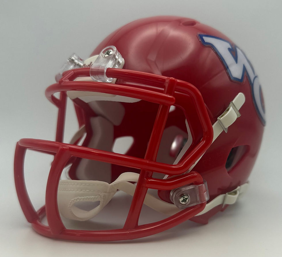 Football Helmet. The ultimate High School mini speed football helmet collectible, perfect High School mini speed football helmets for autographs and collectors. Mini Speed Football Helmet with great graphics. Official High School mini Speed Football Helmet with official High School team decal. ABS plastic Mini Speed Football Helmet shells with plastic facemask. Realistic interior foam padding, vinyl-leather chin strap. This is an affordable High School football helmet for the true fan. Size: 1/2 scale versions of High School football helmets. Size: 6"(L), 4½"(W), 5"(H) - (NOT FOR WEARING).